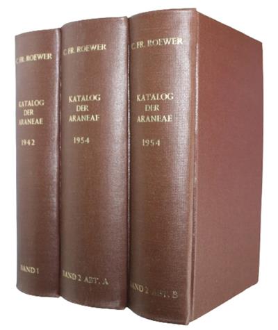 Bd 1: Mesothelae, Orthognatha, Labidognatha: Dysderaeformia, Scytodiformia, Pholciformia, Zodariiformia, Hersiliaeformia, Argyopiformia; Bd 2a: Lycosaeformia, Dionycha [excl. Salticiformia]; Bd 2b: Salticiformia, Cribellata (Synonyma-Verzeichnis, Gesamtindex). An important catalogue of the genera and species of spiders described from 1758 to 1940 (1954 for some groups). Includes bibliography of taxonomic works on spiders published between 1758 and 1954.