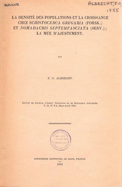 La Densité des Populations et la Croissance chez Schistocerca Gregaria (Forsk.) et Nomadacris septemfasciata (Serv.); La mue D'ajustement