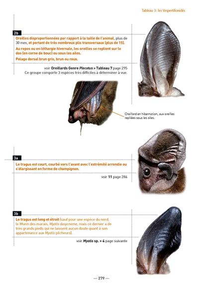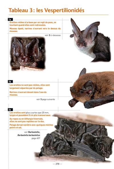 [36 espèces sont présentes de France, Belgique, Luxembourg et Suisse. Chacune fait l’objet d’une monographie détaillée avec description, émissions sonores (sonogrammes), écologie, rythme biologique, conservation, connaissance des populations (carte de répartition)… Le lecteur curieux trouvera également dans les chapitres de généralités des informations sur la paléontologie, la diversité des chauves-souris à travers les continents, la biogéographie des espèces européennes, la biologie des chauves-souris, les rapports que l’homme entretient avec ces espèces. Des chapitres dédiés à l’identification sont proposés pour la reconnaissance visuelle et par l’étude de leurs signaux acoustiques.