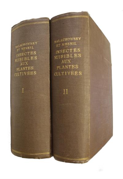 Alfred Serge Balachowsky (1901-1983) was born in Russia but spent most of his life in France. He was a pioneer of biological pest control. Félix Étienne Pierre Mesnil (1868-1938) was a French Biologist. Together they complied the first comprehensive reference work on insect pests in France. It became the standard reference for agronomists, farmers, and plant-health officials for decades. Volume 1 covers pests of fruit trees, vines, cereals and forages; volume 2 covers pests of vegetables, industrial crops, ornamentals, grains, stored products, and includes notes on insecticides. The work is illustrated with over 1,300 photographs and fine line drawings.