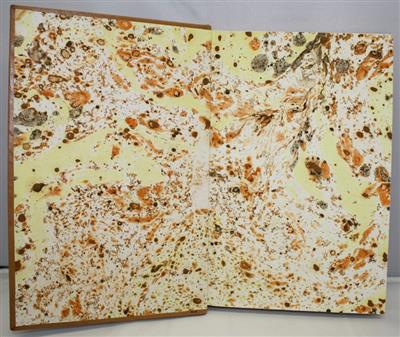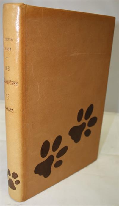 Full tan leather with inlaid dark brown leather pawprint design to spine and front cover; spine slightly faded; a few light scratches and scuffs; hand made marbled endpapers. Origninal front wrapper retained. Fine craft binding by 'M.M.' (Monique Macaux).