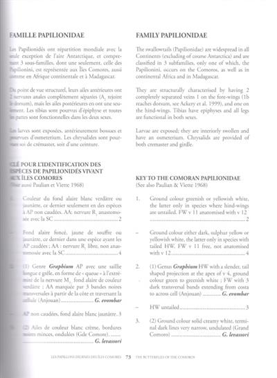 Text French/English. Provides information on the current knowledge of the Comoran butterflies, with necessary information for harmonizing conservation procedures with agricultural practices, which are currently unsustainable. Butterflies are widely recognised as important bio-indicators, rapid in reacting to environmental changes, beautiful, colourful, charismatic and (some of them) easily identifiable, thus more easily monitored than most other organisms. Biological and taxonomic information is provided together with identification keys for families and species, as well as distribution maps and actual-size figures.