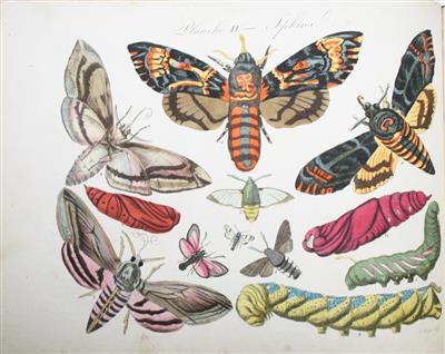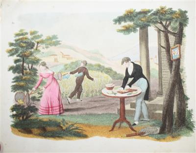 The book opens with a coloured frontispiece depicting children in the countryside with nets, joyfully engaged in collecting butterflies, while a young man stands by a table carefully preparing a specimen. Six exquisite hand-coloured plates, engraved by Joseph Julien Guillaume Dulompré (b.1789), illustrate caterpillars and adult butterflies and moths, complemented by two charming tailpieces. This copy preserves its original printed wrappers, which themselves display a delightful array of entomological collecting equipment.