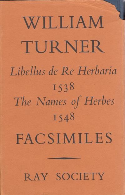Facsimiles with introductory matter by J.Britten, B.D. Jackson and W.T. Stern. The wrapper states: William Turner (c. 1508-68) clergyman, physician, herbalist and naturalist, has long been honoured as the ‘father of British Botany’, being ‘unquestionably the earliest writer among us that discovered learning and critical judgement in the study of plants’. His Libellus de Re herbaria (1538) and Names of Herbes (1548) are the first two printed books relating to British flora which have any claim to originality.