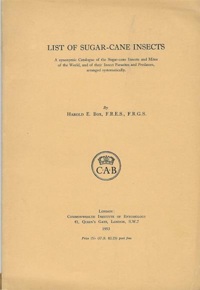List of Sugar-Cane Insects: A synonymic catalogue of the sugar-cane insects and mites of the world, and of their insect parasites and predators arranged systematically
