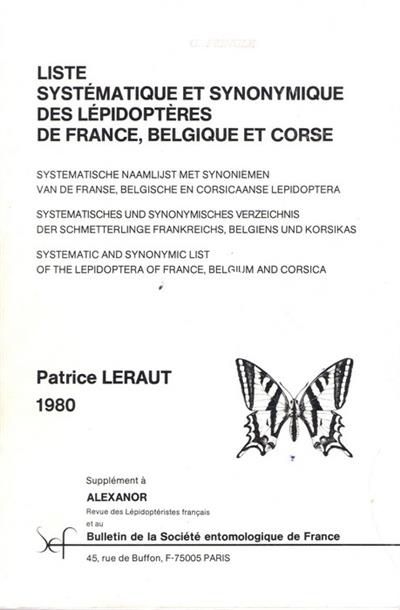 1st edition. Systematic and synonynmic list of the Lepidoptera of France, Belgium and Corsica.