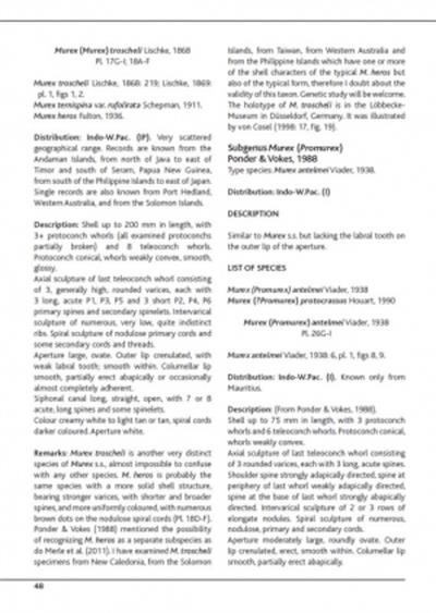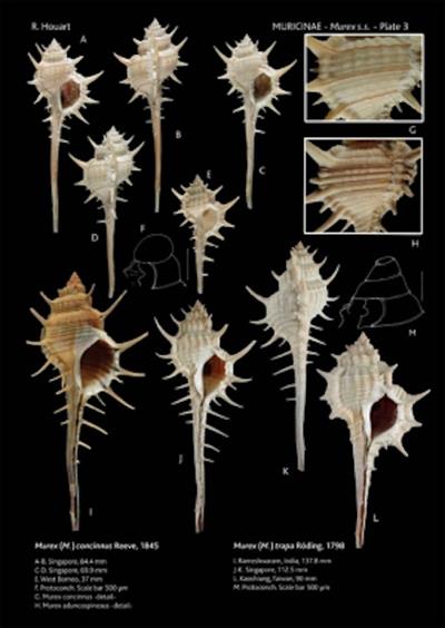 This volume comprises the introduction and the first part of the Muricinae: Murex s.s., Murex (Promurex), Haustellum, Bolinus, Vokesimurex and Siratus. Each species is listed with the author’s name(s), the date of description, synonymy, distribution, description and some comments; the chresonymy is cited only for misidentified figures in recent publications dealing only with Muricidae. The type locality and the type material are noted for species named after 1971, even if the name is now considered to be invalid. Each species is illustrated in colour with many specimens, from the author’s collection, unless labelled otherwise. Other black and white illustrations, mostly in the text, illustrate some type specimens, while SEM photographs are provided for the radula and other details. Drawings or photos of the protoconch are provided for most of the species.