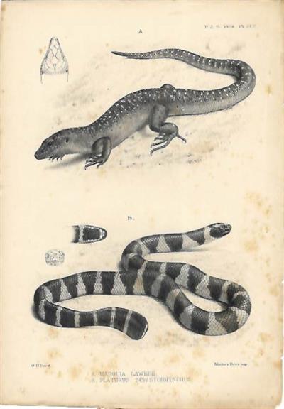 An original plain lithographic print by the South African illustrator George Henry Ford who joined the British Museum in 1837, to accompany a paper by Albert Günter 'A contribution to the Fauna of Savage Island'. Proc. Zool. Soc. London 1874. Plate depicts Günther's Emo Skink Mabouia lawesii and the Flat-tail Sea Snake Platurus schistorhynchus