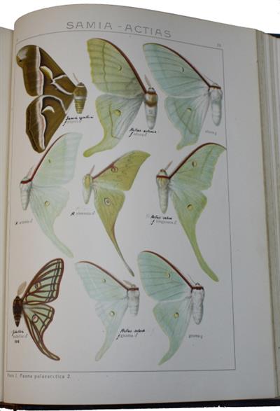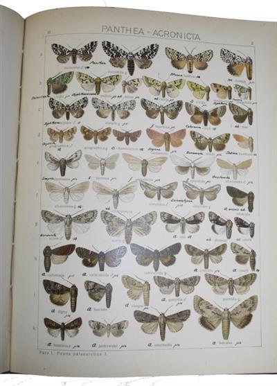 Vol. II: Palearctic Bombyces & Sphinges; Vol. III: Palearctic Noctuae; Vol. IV: Palearctic Geometrae, with the Supplement to Vol. III + IV (Supplement to Vol. IV incomplete with pp. 1-248 (lacking the later published pages, 721-764 [additions, corrections and index]), and 26 (of 53) plates (no's 1-12, 15-17, 19-29) only.