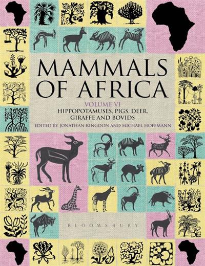 Volume VI, edited by Jonathan Kingdon and Michael Hoffmann, comprises a single order, currently subdivided into three suborders, containing the hippopotamuses, pigs, chevrotains, deer, Giraffe, Okapi, buffalos, spiral-horned antelopes, dwarf antelopes, duikers, grysboks, Beira, dik-diks, gazelles, Klipspringer, Oribi, reduncines, Impala, alcelaphines, horse-like antelopes, sheep and goats; the volume contains 98 species profiles.