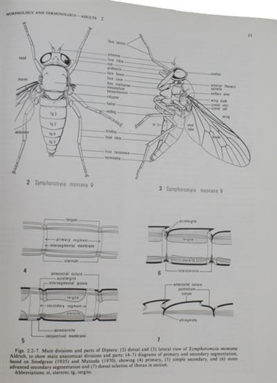 Vol. 1 contains introductory chapters, keys to families for adults and larvae, and detailed treatment of the 24 families of Nematocera and 19 families of orthorrhaphous Brachycera; Vol. 2 covers the 65 families of the Muscomorpha (Cyclorrhapha). Keys to genera are provided for all families. A third volume on 'Evolution & Classification' was published in 1989, but is not present here.