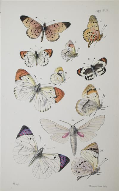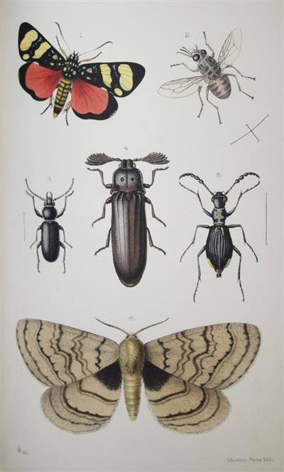 With additions by A. Sidney Olliff and W.L. Distant. Appendix IV Entomology (pp. 338-389, Extracted from Matabele Land and the Victoria Falls, second edition). Fine hand coloured lithographic plates, drawn by Westwood and printed by Mintern Bros. Folding map of 'South Eastern Africa shewing the country traversed by Mr. F. Oates 1873-5'. This Appendix describes insects collected by Oates, later acquired by the Entomological Department of the Museum of the University of Oxford. Francis (Frank) Oates (1840–1875) was a British naturalist and explorer; he was one of the first Europeans to see the Victoria Falls.