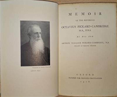 First edition. Rare privately published memoir of Octavius Pickard-Cambridge (1828-1917), an English zoologist and clergyman. He was born in Bloxworth, Dorset, and succeeded his father as rector there in 1868. He was best known for his work on spiders, including Spiders of Dorset (1879-1881).