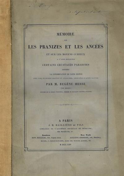 Memoire sur les Pranizes et les Ancées et sur les moyens curieux a l'aide desquels certains crustacés parasites assurent la conservation de leur espèce
