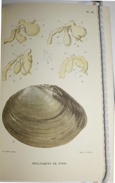 Tome. I: Introduction et Gasteropodes; Tome II: Pelecypodes. Published as Tome Deuxieme and Troisieme of 'Voyage Zoologique d'Henri Gadeau de Kerville en Syrie (Avril - Juin 1908)'. Henri Gadeau de Kerville (1858-1940) was a French naturalist and archaeologist. In 1908 he undertook an expedition to Syria, collecting a large number of zoological specimens (many of which were new to science). The French malacologist Alfred Louis Pierre Germain (1878-1942) undertook the scientific description of the molluscs which Gadeau de Kerville collected. In the introduction to this work, Germain includes a brief history of leading naturalists who collected molluscs in Syria stating ‘After so many explorations and so much work, one could believe that there was nothing left to glean in Syria. The successful journey by Henri Gadeau de Kerville brings a formal denial of this supposition. The learned naturalist of Rouen preferred to confine himself to the study of a relatively small region of Syria; but as usual, he explored it methodically and meticulously. So, he was able to collect considerable material, and we can say that, by its zoological importance, the journey worthily matches those of his predecessors.'