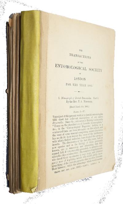 Rare monograph on the British species of this family of parasitic wasps. 7 of 8 parts (lacking Pt V). From Transactions of the Entomological Society, London. Chromolithographic plates by the author and others. Thomas Ansell Marshall (1827-1903), studied Classics at Oxford University. Later he took holy orders, holding a number of livings, including a period in Antigua in the West Indies. Although interested in all aspects of entomology, he had a special interest in parasitic Hymenoptera.