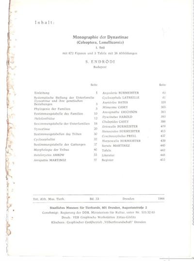 Text German. Key to Scarabaeid subfamilies, to Dynastine tribes, to genera of Cyclocephalini. All species of Cyclocephalini keyed and described. Genitalia illustrated. Ent. Abh. Mus. Tierk. Dresden, Bd. 33.