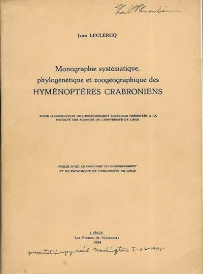 Monographie systématique, phylogénétique et zoogéographique des Hyménoptères Crabroniens