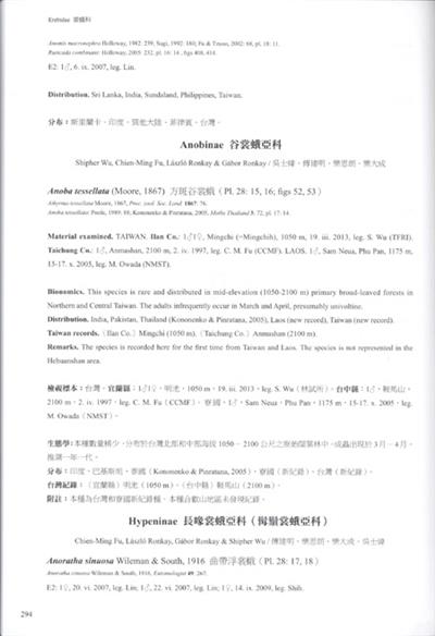 Text Chinese/English (bilingual). Situated in the centre of the Central Mountain Range, Hehuan Mountain Range (Taiwan), connected by seven peaks with the 3,422 m high Hehuan N. Peak as the highest point, the collecting sites treated in this book are all located higher than 2350 m. 934 species in 19 families are recorded and illustrated. Includes all identified species from the Hehuanshan. Colour plates of set specimens, black-and-white genitalia photographs.