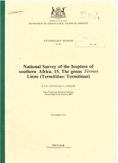 National Survey of Isoptera of Southern Africa. 15. The Genus Termes Linne (Termitidae: Termitinae)
