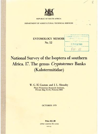 National Survey of the Isoptera of Southern Africa. 17. The Genus Cryptotermes Banks (Kalotermitidae)