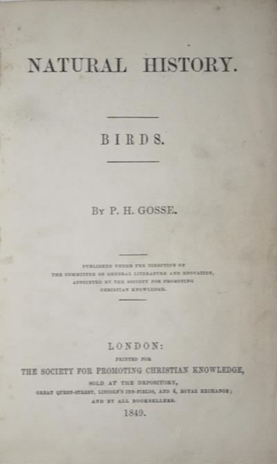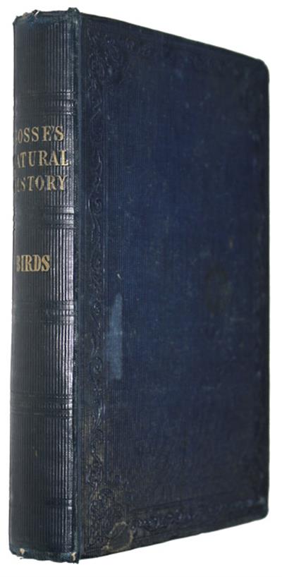 Sm. 8vo (170x100mm), orig. blue cloth, vertical rib, blind ornamental frame within ruled border to both boards; spine with four double and one single blind bands; spine title gilt GOSSE'S/NATURAL/HISTORY/BIRDS. Minor wear to extremities; a few nicks to spine ends. Endpapers yellow, but with front free endpaper removed. Owner's name in ink and some pencil notes to front pastedown. Good.