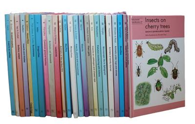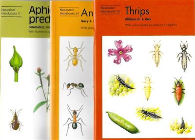 The first 27 volumes from the Naturalists' Handbook series (all hardback editions except for the three marked PB, which are paperback): 1: Insects on Nettles (2nd ed.); 2: Grasshoppers (2nd ed.); 3: Solitary Wasps (2nd ed.); 4: Insects on Thistles (2nd ed.); 5: Hoverflies; 6: Bumblebees; 7: Dragonflies (2nd ed.); 8: Common Ground Beetles; 9: Animals on Seaweed; 10: Ladybirds; 11: Aphid Predators (PB); 12: Animals of the Surface Film; 13: Mayflies; 14: Mosquitoes; 15: Insects, plants and microclimate; 16: Weevils; 17: Plant galls; 18: Insects on cabbages and oilseed rape; 19: Pollution monitoring with lichens; 20: Microscopic life in Sphagnum; 21: Animals of sandy shores; 22: Animals under logs and stones; 23: Blowflies; 24: Ants (PB); 25: Thrips (PB); 26: Insects on dock plants; 27: Insects on cherry trees.