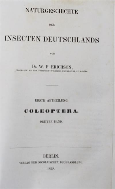 Text German. Of this work, begun by W.F. Erichson (1809-1848), and continued by others after his death, only Abt. 1: Coleoptera was published (consisting of 6 volumes which appeared between 1845 and 1899). This volume covers families Scaphidiidae to Scarabaeidae.