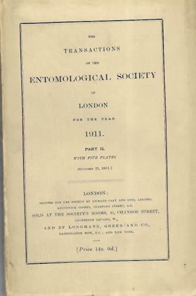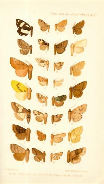 Transactions of the Entomological Society of London, 1911: 189-407. Includes new and unrecorded species contained in a collection of two thousand species by the Japanese collector Mr Uehara and the author during a period of 11 years, 1892-1903, from the four great islands of Japan, Hondo, Shikoku, Kyushu and Yezo. Two chromolithographic plates by Horace Knight (fl. 1901–1920), printed by West, Newman.