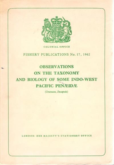 Colonial Office Fishery Publications No. 17. Concerns the Penaeid prawns which have a wide distribution in the seas about Malaya and are one of the most valuable products of tropical fisheries.
