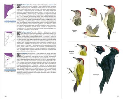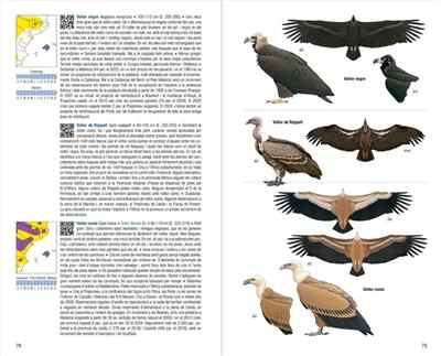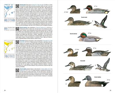 The text includes the Catalan name and the scientific name (indicating when names differ in the Valencian Community or the Balearic Islands), size, plumage differences with similar species, voice, ecological requirements, behaviour, distribution in the Western Palearctic and in the area covered by the guide, as well as population size and trend.