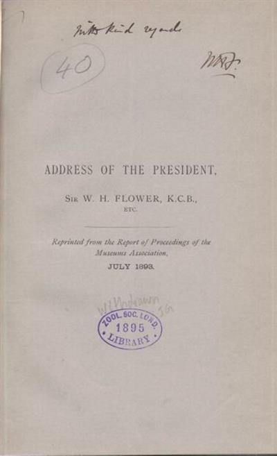Address of Sir William H. Flower, K.C.B., D.C.L., F.R.S., etc, President of the Museums Association. Reprinted from the Report of Proceedings of the Museums Association July 1893, pp. 21-48.