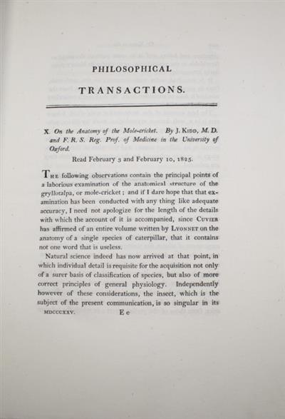 From Philosophical Transactions of the Royal Society. Vol. 115: 203-246. Fine engraved plate of mole-cricket with anatomical detail. John Kidd (1775-1851) was an English physician, chemist and geologist. He was the first Aldrichian professor of chemistry, at the University of Oxford.