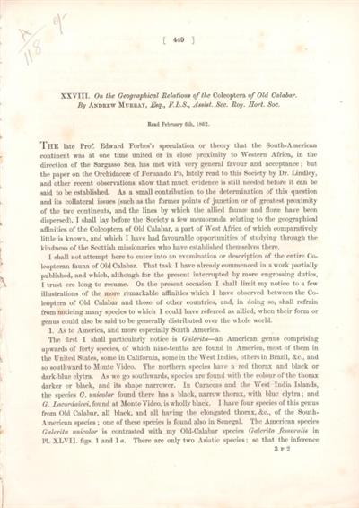 Extracted from Trans. Linn. Soc. Vol. 23. An interesting contribution to the theory that the South American continent was once united to West Africa- based on observations on the Coleoptera of Old Calabar (now part of Nieria).