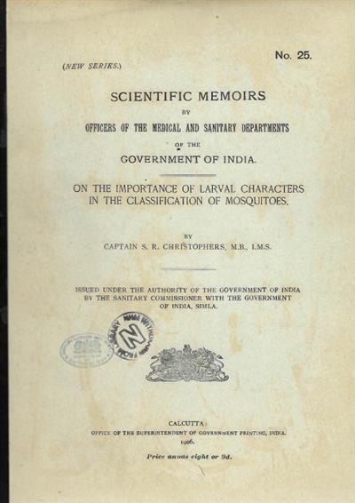 Scientific Memoirs by Officers of the Medical and Sanitary Departments of the Government of India. No 25. Samuel Rickard Christophers (1873-1978) was described as one of the great pioneers of Medical Entomology, 'to rank equally with his famous peers, Sir Patrick Manson, F.R.S., and Sir Ronald Ross'. H. E.Shortt; P. C. C. Garnham (1979).