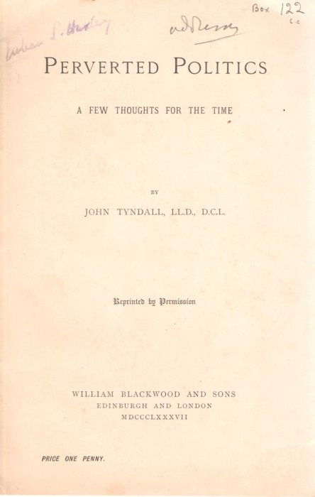 John Tyndall (1820-1893) was an Irish physicist renowned for his research on diamagnetism, infrared radiation, and the physical properties of air. By the 1880s, he had become one of the most outspoken scientific critics of Irish Home Rule. In this pamphlet, published during a period of intense constitutional turmoil, Tyndall, writing as an Irish Protestant Unionist intellectual, condemns what he viewed as the moral and intellectual decline of British politics. He warns that yielding to nationalist or sectarian demands would undermine the integrity of the United Kingdom.