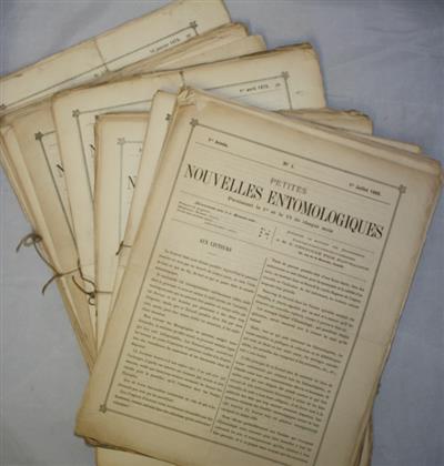Rare. 'Petite Nouvelles Entomologiques' was published twice-monthly between 1869-1879 in a total of 216 issues. Each issue consists four printed pages. Published by Deyrolle in Paris, contents include entomological news, notices, and announcements. Printed by Oberthur fils, Rennes. After 1879 it continued under the title 'Naturaliste'.