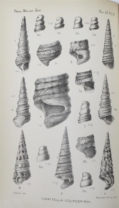 The journal began under the title Proceedings of the Malacological Society of London, and from Vol. 42 onwards changed to Journal of Molluscan Studies. Includes Indexes to vols 1-15 (bound in a separate volume); also with Vol. 50 (part 1) bound in the final volume. A good 92-year run, lacking only Vol. 15.Some of the lithographic plates in the early volumes by G.B. Sowerby (at least one hand-coloured), J. Green and others.