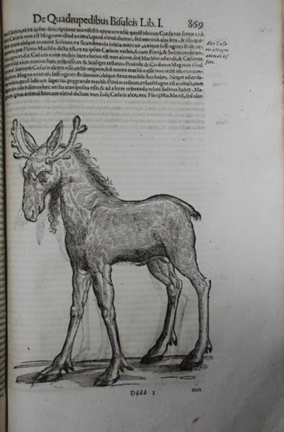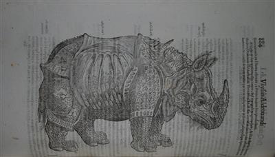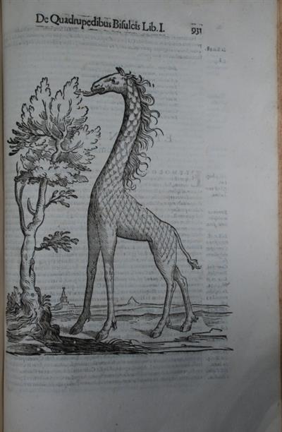 Second edition. Colophon dated 1641. This volume, first published in 1621, includes cloven-hoofed quadrupeds, including, cattle, deer, pigs, antelopes, gazelles, goats, sheep, etc., and also with fine woodcuts of camels, a giraffe and a rhinoceros (the latter based on Dürer's famous woodcut of 1515).
