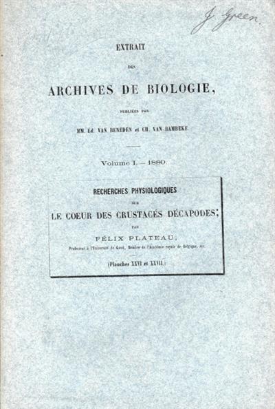 Recherches physiologiques sur le coeur des Crustacés Décapodes