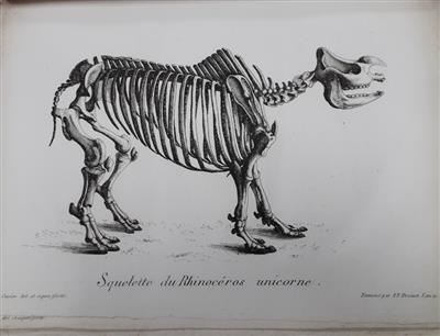 Vol. 1 includes Discours préliminaire in which Cuvier introduced the idea of geological ‘revolutions’ to explain mass extinctions of prehistoric species. Other papers include an essay on an Egyptian ibis mummy brought from Thebes during Napoleon's campaign in Egypt; and with Alexandre Brogniart (1770-1847) an updated version of Cuvier's important stratigraphical memoir of 1810, Essai sur la Géographie Minéralogique des Environs de Paris, which contributed to the concept of faunal succession in rock strata of different periods. In Vol. 2 Cuvier describes species of pachyderms found in recent alluvial deposits, including elephants, mastodons, rhinoceros, hippopotamus and tapir. In Vol. 3 Cuvier's recalls the challenges of reconstruing fossils of different species. Vol. 4 concerns fossil horses and pigs, bears, hyenas and big cats and concludes by describing fossil sloths, crocodiles, turtles, and marine dinosaurs.