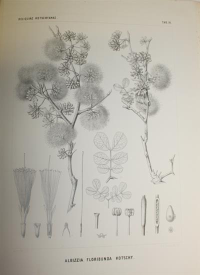 Text German. This important botanical work is by the German botanist, ethnologist and African explorer Georg August Schweinfurth (1836 -1925). It describes and illustrates many new species of plants that the Austrian botanist and explorer Theodor Kotschy (1813 -1866) collected from 'free negroes' during his travels from 1837 to 1839 while he was companion to the Austrian geologist, Joseph Ritter von Russegger (1802-1863). Together they explored mountains south of Kordofan (a former province of central Sudan).
