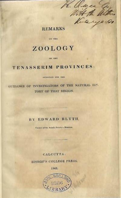 Guide to the fauna of the Tenasserim Provinces in Burma. Edward Blyth (1810-1873) was an English zoologist, and curator of zoology at the museum of the Asiatic Society in Calcutta, India.