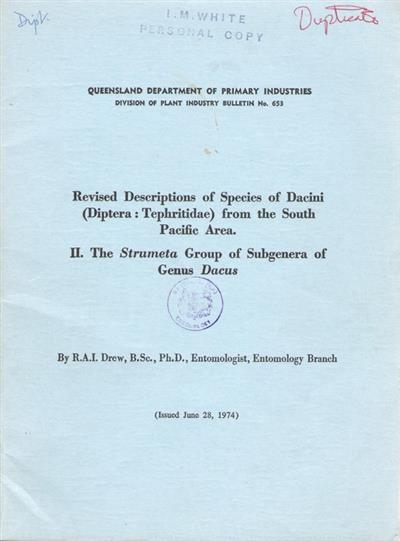 Revised Descriptions of Species of Dacini (Diptera: Tephritidae) from the South Pacific Area: I. Genus Callantra and the Dacus Group of Sugenera of Genus Dacus / II. The Strumeta Group of Subgenera of Genus Dacus