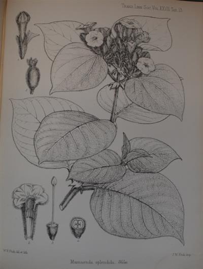 Text Latin. Extracted from Trans. Linn. Soc. Vol. XXVII. Scarce. Lithographic plates by W.H. Fitch (numbered 1-25, 11A). Includes descriptions of 12 new genera and 48 new species of plants from Angola. Friedrich Martin Josef Welwitsch (1806-1872) was an Austrian botanist and noted plant collector. From 1839-1853 he was director of the Botanical Garden of Lisbon. Due to Portuguese colonial interests in West Africa, Welwitsch travelled to Angola and Benguela collecting vast numbers of plants and other natural history specimens. Asa Gray wrote in an obituary (1873, American Journal of Science and Arts) that Welwitsch’s exploration of this region ‘was rewarded by the discovery of more curious plants, probably, than any other that has been undertaken since Australia was opened to botanists….In his ‘Sertum Anglolense’, a splendid memoir published by the Linnaean Society, with twenty-five plates, some of his most interesting discoveries are described’.
