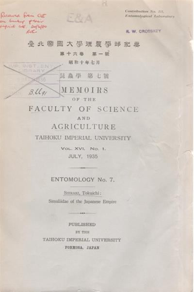 Text English. Memoirs of the Faculty of Science and Agriculture Taihoku Imperial University Vol. XVI No. 1. Entomology No. 7.