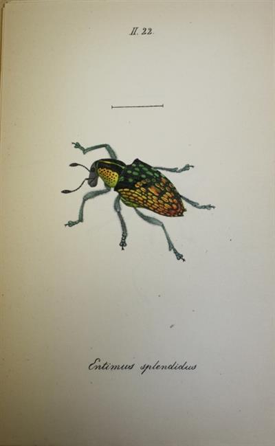 Text Latin and German. One of the rarest works on Coleoptera. Originally intended to be published in two volumes, each consisting of 10 Hefte (fascicules) (each with 8 plates and 8 leaves of descriptive text), however the final part of the second volume was never published. Of the 19 published Hefte, we offer here 16 (1-14, 17, 18), with 128 (of 152) mostly hand-coloured plates. Co-authored by two Swiss naturalists, Jonas David Labram (1785-1852), a botanical and entomological artist, and Ludwig Imhoff (1801-1868) a physician and zoologist. It is very unusual to find this work in its original state, with original parts in their printed wrappers. The 'Heft' numbers are hand written on each of the printed wrappers, which are dated, 1838 (Heft 1-5), 1840 (Heft 6-12), 1845 (Heft 13-14, 17, 18). Bousquet gives dates of publication: Hefte 1-2 (1838), 3-4 (1839), 5-7 (1840), 8-9 (1841), 10 (1842), 11 (1843), 12-13 (1845), 14 (1847), 15 (1848), 16-17 (1849), 18 (1850), 19 (1851). A title page and preface (dated 1838), a title page to Part 1 (fasc. 1-10) (dated 1842) and index to Part 1 (fasc. 1-10) are present. No preface or index were published for Part 2.