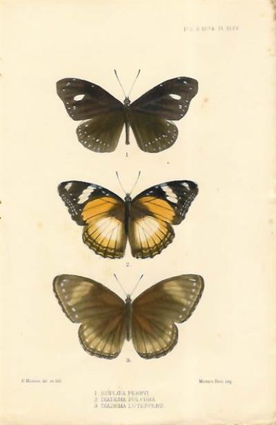 Attractive hand-coloured lithographic plate of butterflies by the illustrator and printer R. Mintern. From 'List of Diurnal Lepidoptera of the South-Sea Islands', by A.G. Butler, Proceedings of the Zoological Society of London, 1874.