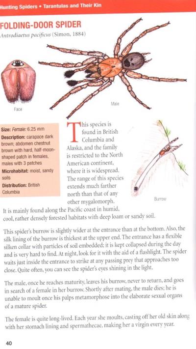 Illustrated guide to the spiders of western Canada, their habitats and habits. Over 400 full-colour illustrations and photographs of spiders and their webs, emphasizing key identifying features. Description of abdomen, carapace and size for each species, as well as the microhabitat is which it is found. Information about spider anatomy, feeding, reproduction, moulting and web building. Instructions for how to observe and collect spiders.