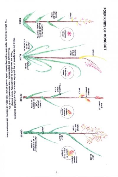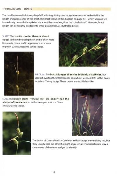 The book is in ten sections, first distinguishing sedges and rushes from grasses and from each other, then picking out salient features to help identify some common rushes and non-Carex sedges. The largest section covers 21 of the most common Carex sedges, using both a Ready Reference Table and a Flowchart, to pin down each identification.